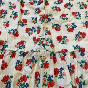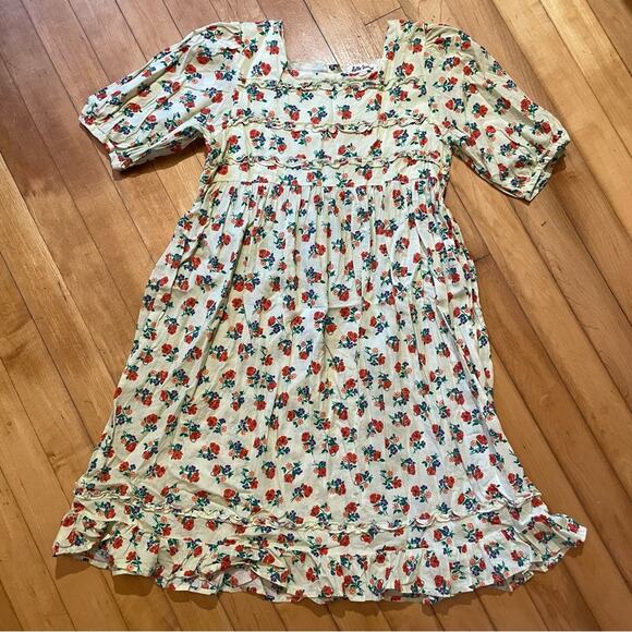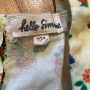 Size 10. Pale yellow with summer floral. Ruffled bodice and hemline. Back button closure. 100% cotton.