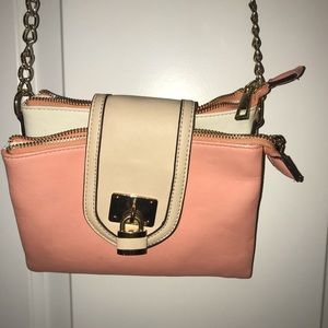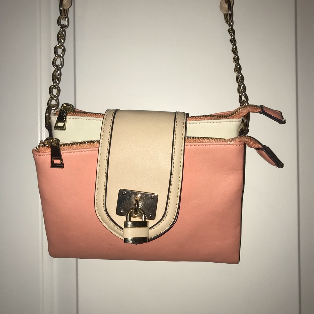 Gorgeous bag! Has two zipper sections and one section in the middle of the two! Very spacious. Hardly used.