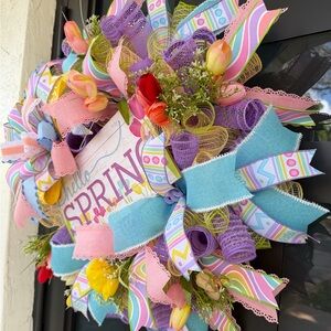 Handmade with a wood sign, mesh ribbons, flowers, and wired ribbons on a wreath base. This measures approximately 27” in diameter and 8” deep.