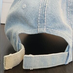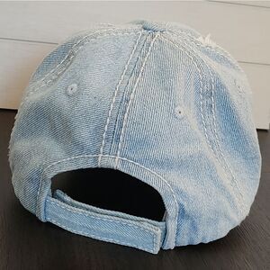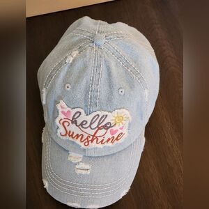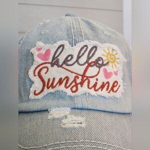 Light blue distressed denim baseball cap with 'Hello Sunshine' patch. Features colorful embroidery.