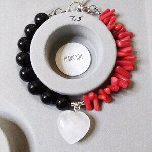 Hello Sweetheart! Massive & Heavy! Black Jasper + Coral + Quartz Heart Bracelet