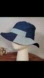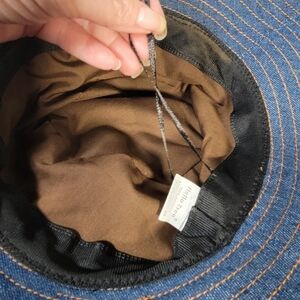 Denim patchwork bucket hat. Lighter and darker blue cotton fabric patches make up a soft cotton hat. Contrasting gold stitching. Perfect for sunny days. Interior lining. Adjustable interior ribbon. 100% cotton. Made in the U.S.A.