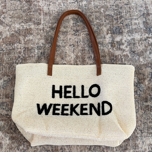 NWOT Embrace casual style with the Hello Weekend Cream Tote Bag. Perfect for everyday use, this bag combines functionality with a playful design. The cream color adds a touch of elegance, making it a versatile accessory for any outfit.