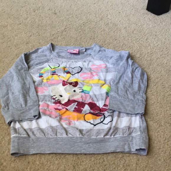 It is a long sleeved shirt and the base color is grey with a design on the front of hello kitty