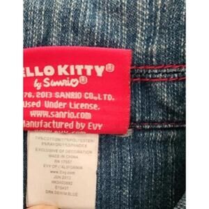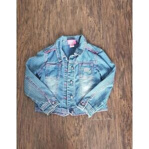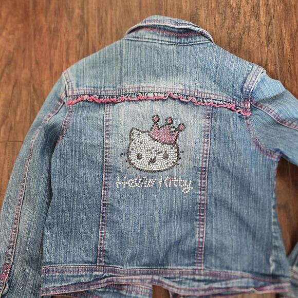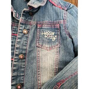 Gently used condition girls size 6 Hello kitty design denim jean jacket from macy's. Hello kitty written on the front pocket and her face on the back of the jacket. Pink stitching. Comes from smoke and pet free home. Tags- girls size 6, jean jacket, denim jacket, hello kitty