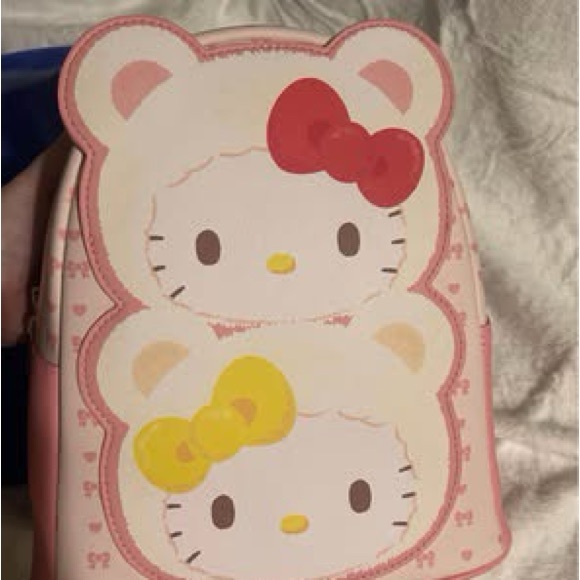 Charming hello kitty LoungeFly backpack featuring adorable hello kitty face with red and yellow bows. Grab this bag for a fun outing and show your hello kitty love!!
