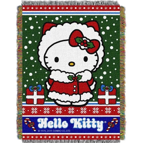 Sanrio's Hello Kitty, with her yellow dot nose brings her endless charm to this Christmas-themed tapestry throw from the Northwest company. In an adorable Christmas outfit complete with mistletoe Bow, this playful, colorful 46"x60" tapestry captures Hello Kitty's vivid colors, while creating a high quality, versatile throw. The 100% polyester, machine washable throw is as equally perfect for keeping warm, as it is for displaying around the home as a decorative throw, or, even as a Wall-Hanging in any room! made in America.