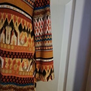 Hello miss dress multicolored and multi pattern size large pit to pit size is 19" top of shoulder to bottom hem is 34" cowl neck has belt loops but doesn't have belt has wear to it but is still in good shape. if you have any questions please message me bundle for bigger deals Bin A-45