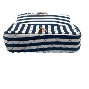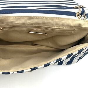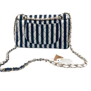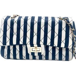 Add a nautical chic vibe to your wardrobe with this 3AM Forever by Hello 3AM quilted crossbody and shoulder clutch bag. Featuring a coastal navy and white striped quilted design. The gold-tone chain strap is adjustable for use as a crossbody or shoulder bag, making it perfect for day-to-night transitions. Lightweight yet spacious making it perfect for summer vacations, and resortwear.