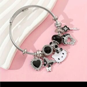 Hello Kitty Charm Pendant Silver & Black Tone Bangle Bracelet