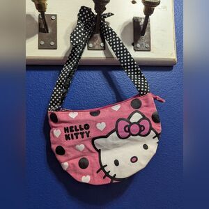 Cute Hello Kitty shoulder bag with pink and black polka dots. Features a Hello Kitty face and bow design.
