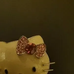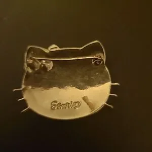Pre-owned in good condition.White enamameld pin with a glittery sheen. Has a pink rhinestone bow in the hair and metallic silver whiskers.