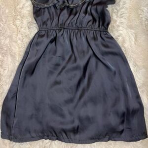 Hello Miss boutique one-shoulder slate grey dress. Trimmed ruffle with beading in front. Elastic waist with an A-line skirt.