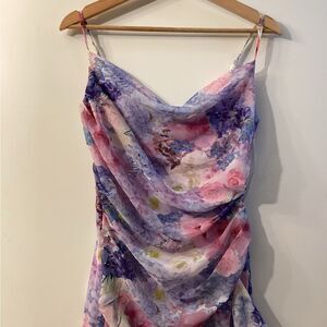 This stunning gown by Hello Molly features an asymmetrical design with elegant ruching and ruffles cascading down the skirt. The sleeveless dress is adorned with spaghetti straps and showcases a dreamy blend of pink and blue hues, perfect for prom or cocktail events.