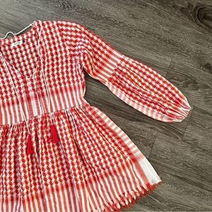 Gently worn in excellent condition red and white long sleeve dress with tassel detail