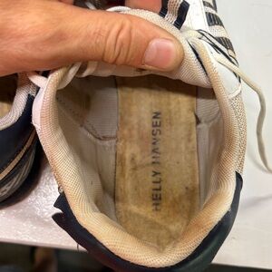 Helly Hansen athletic shoes in cream and black. Sleek design with durable construction. These shoes have quite a bit of stains and no insoles. See photos for details. They do have great traction still left on the bottom and they are made for water so they can drain. Please feel free to request more information or make me an offer.