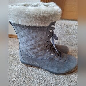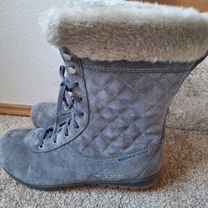 Helly Hansen Eir 4 snowboots. Gray Quilted Suede. Waterproof. Faux fur. Lace up. Round toe. EUC Womens size 10 Shaft height 10" measurements are approximate