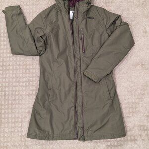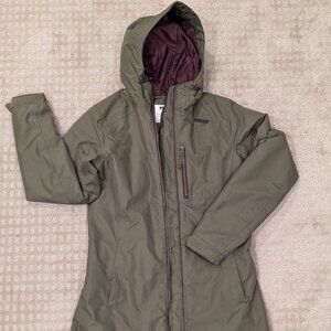 Bought new on Amazon and worn for 1 winter, this women's winter jacket from Helly Hansen with olive exterior and burgundy lining is a cold weather staple. Features a hood and full front zipper. Warmth and sporty detailing in an insulated winter coat. This jacket will last you decades if you care for it!