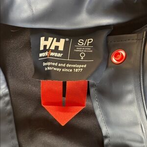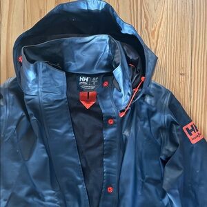 Navy utility jacket with hood. Features front pockets and red accents. Ideal for outdoor use.