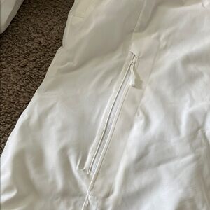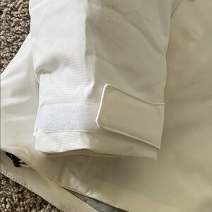 Helly Hansen jacket with navy hood and accents. White body with front zipper. Perfect for outdoor adventures.