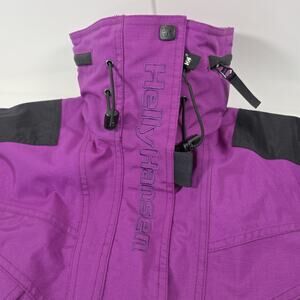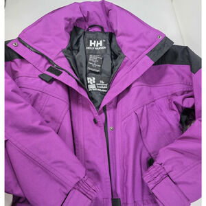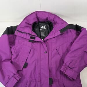 The Helly Hansen Tech Jacket is a stylish and functional outerwear option for women in size Medium. Made with a durable polyester outer shell and lined with cozy polyester, this jacket features a removable hood, 3M Thinsulate insulation, and waterproof technology, making it perfect for winter and fall seasons. The jacket comes in a solid purple color with accents like zipper pulls and the Helly Hansen logo. With a mid-length cut, elastic waist, and multiple pockets, this jacket combines practical features with a touch of retro 90s style, ideal for travel or casual occasions.