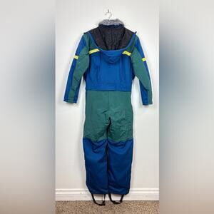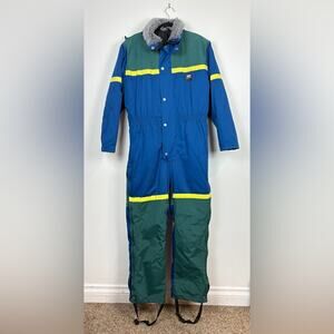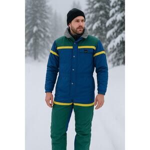 This is a heavy duty snow suit. Sherpa linen from waist down. Detachable hood. Inside chest pocket. 2 pockets at front. Ventilation zips on both sides. Boot stirups with zipper ankles.
