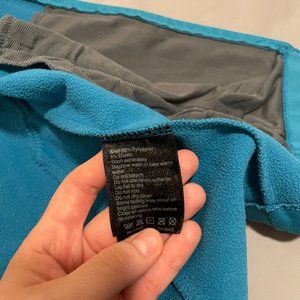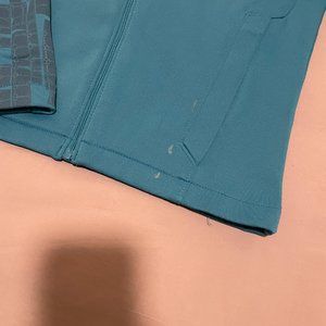 Helly Hansen teal jacket with print on one sleeve. Very comfortable and in great condition with one small silver paint splatter on bottom left panel. See photos for detail. Great jacket for layering on cold days or as lighter outerwear.