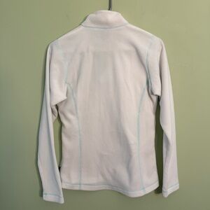 Soft white fleece with light blue accents. Quarter -zip design. Ideal for layering.