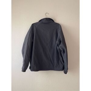 It is all black with the fleece lining but not on the arms. Embroidery on the front. In great condition, there is no flaws. It is a thick jacket. Water proof.