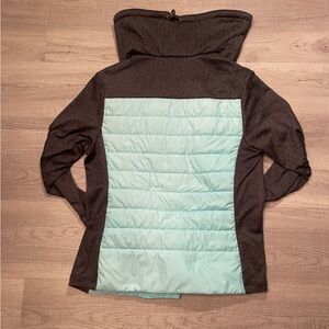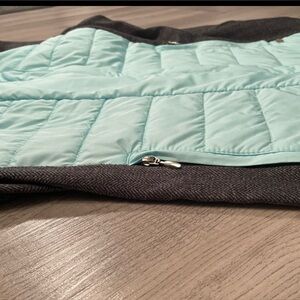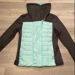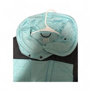 Style tags: fall, winter, primaloft, HH, slimming, warm, ski, active, comfortable, stylish, chevron, herringbone pattern, light blue, cyan