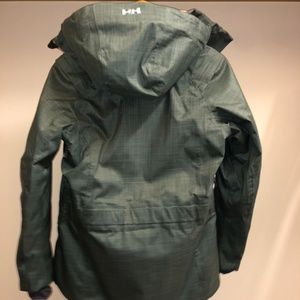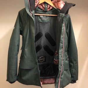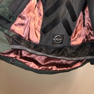 It is a very warm and water repellent ski jacket. It has two outside lower pockets with zipper, an upper zipper and one inside pocket with a zipper. At the bottom, it has adjustable straps to make the fit tighter. The hat is removable, it fits true to size and it is in great conditions.