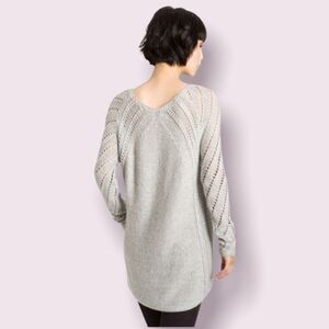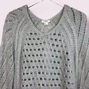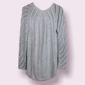 In Light Heather Grey Super Soft Sweater open knit pullover that dips to a longer length in back.