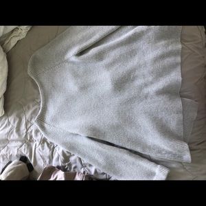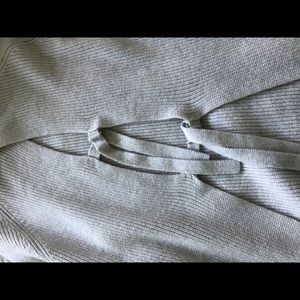 Comfy and cute sweater with an adjustable open back! Has a bit of discoloration around the one sleeve but this can be scrubbed out