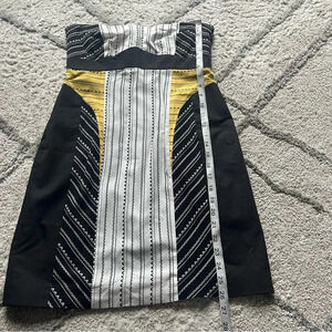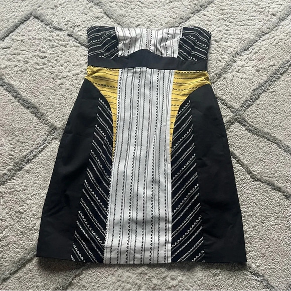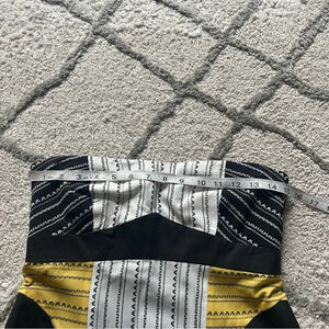 Chic mini dress with bold black and yellow design. Strapless with intricate patterns. Perfect for a night out.