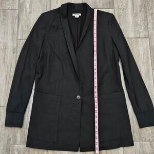 Description: Helmut Lang tailored blazer jacket in black, women’s size 4. Crafted from a luxe cupro-silk blend, featuring a sleek single-button closure, notched lapels, and flap front pockets. Modern minimalist design with a lightweight drape, ideal for workwear or elevated layering.