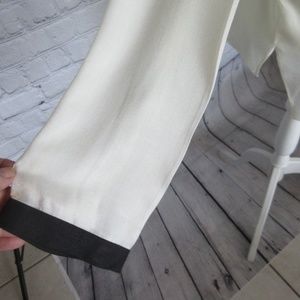 Helmut Lang has a reputation of making beautiful quality clothing. Here's a fine example of this gorgeous blouse of off white, taupe and black color block blouse of 47% viscose, 23% cotton and 13% linen, 11% nylon and 6% elastane. It has been worn most likely just a few times and in wonderful condition. The only thing is that the stitching on the top back middle where it meets the black part has come undone or torn apart but I think it can be sewn back when taken to a seamstress, see photo.
