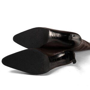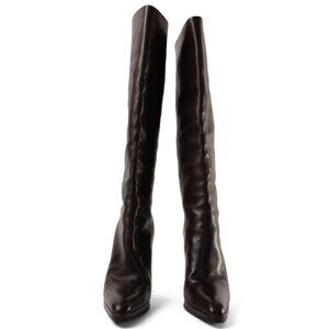 Sleek and sophisticated, these tall Helmut Lang boots feature supple dark brown leather with a soft natural texture and a slim, sculpted silhouette. Size 36.5