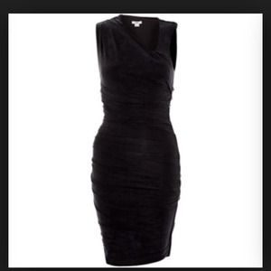 Figure flattering ruching and draping. Asymmetric draped neckline, sleeveless, ruching at sides. Draped at front and back with asymmetric hem. Draping hides everything!! NEVER WORN.