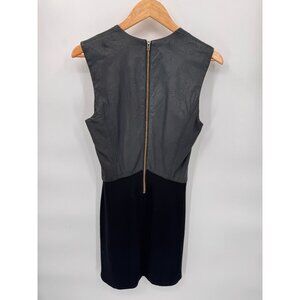 This elegant black midi dress combines faux leather and knit materials for a sophisticated look. Ideal for professional settings, its sleeveless design and back zipper add a modern touch.