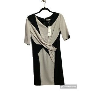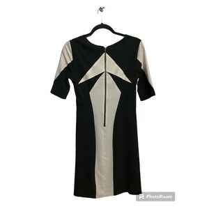 Helmut Lang Geometric Short Sleeve Mini Shift Dress Size 4 Polyester and silk Zip closure Beige and black V-neck No flaws No stretch NWT Pit to pit 17 Length 36.5 MSRP $520