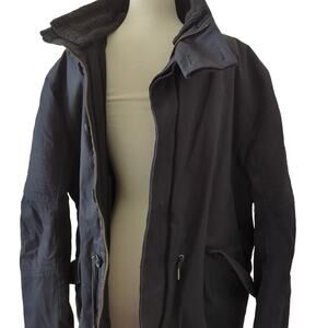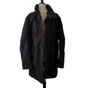 helmet lang designer size extra large men's jacket has a internal cinch belts. style number HLM2168 black cotton insulation polyester internal pocket police neckline for comfort can be removed if desired. heavy duty thick weighted knitty coats zip front with additional button closures. belted front pockets inside and outside very warm winter jacket length 38 flat across underarm 25 gently pre-owned condition