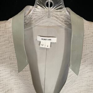 Light sage green leather-trimmed textured blazer by Helmut Lang. Diagonal-cut, asymmetrical leather pieces design. Collarless, front slit pockets, hidden button closures on front and sleeve cuffs, built-in shoulder pads. Excellent pre-owned condition. Bust across the front area measures approx. 18.5 inches. Original Retail: $895.