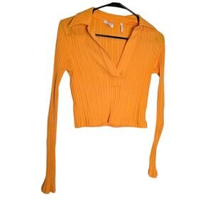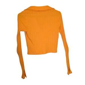 Vibrant orange blouse. Ribbed texture. Long sleeves. Cropped fit. Stylish collar.