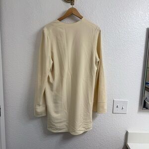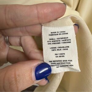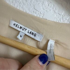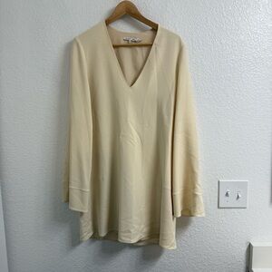 Modern elegance meets effortless style in this soft pale yellow shift dress from Helmut Lang. Made from a fluid blend of acetate and viscose, and fully lined in 100% silk, this piece feels just as luxurious as it looks. The deep V-neck, clean lines, and lightly flared sleeves give it that signature Helmut Lang minimalism—perfect for transitioning from day to evening.