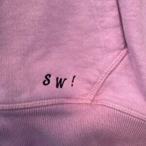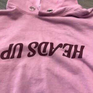 Vibrant pink pullover with bold black lettering. Features a plane graphic and catchy slogan.