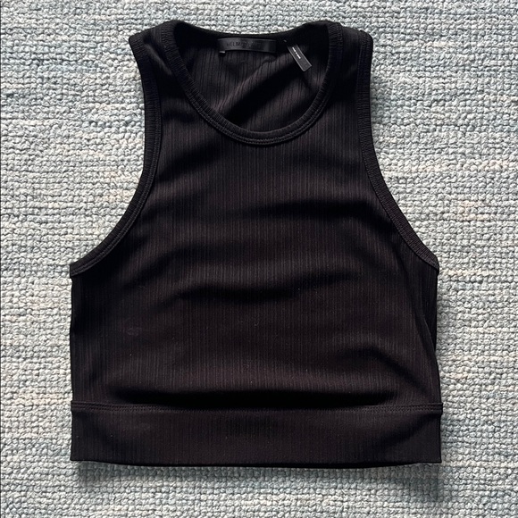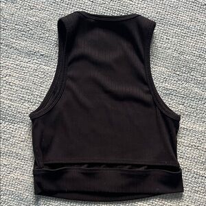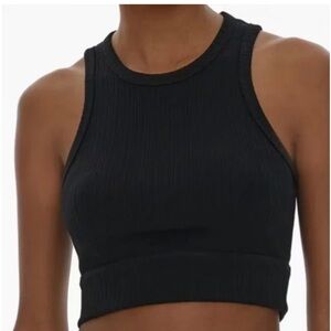 Chic black ribbed crop top by Helmut Lang. Ideal for stylish layering or solo wear.