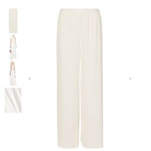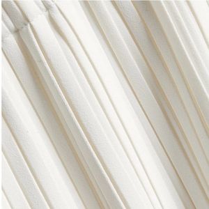 Pleated Crepe de Chine. Color is Creme (very minimally off-white). High-rise, elasticized waist (paneled in the front, elasticized in the rear). Side slant pockets. Slip on. Non-stretchy, mid-weight, fabric. Unlined. Dry clean only. 100% Polyester.