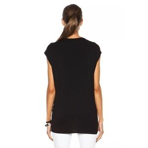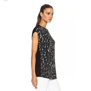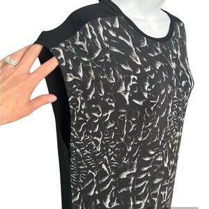 Helmut Lang Strata lightweight short sleeve gray black jersey top. Top is sleeveless with a cap sleeve look. Solid black on back and front is black with gray and white design. Soft stretchy lightweight material. Can be worn tucked in or untucked. Super easy and comfortable to wear. Women’s size medium. See pictures for approximate measurements. Excellent condition.