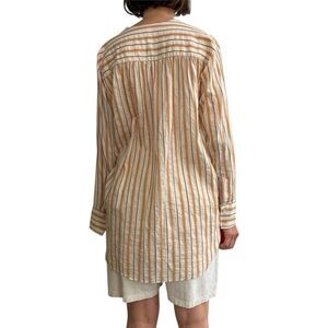 Helmut Lang striped tunic blouse is a versatile piece for any wardrobe. Made from a soft cotton blend, it features vertical orange and brown stripes on a white background, a deep V-neckline, and long sleeves with button cuffs. The relaxed tunic length makes it perfect to pair with jeans, leggings, or tailored pants for a polished yet comfortable look.