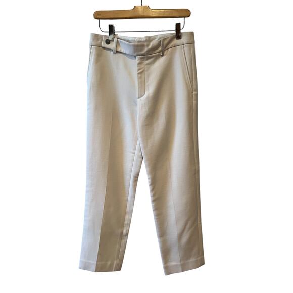 New Helmut Lang wool & spandex ankle length trousers in ivory winter white, size 6. Features zipper button & snap closure, silk lined front pockets, flat front styling. Small bit of moth damage in fabric near back of pants above hem - difficult to see - see photo. Also a bit of dirt on hem area